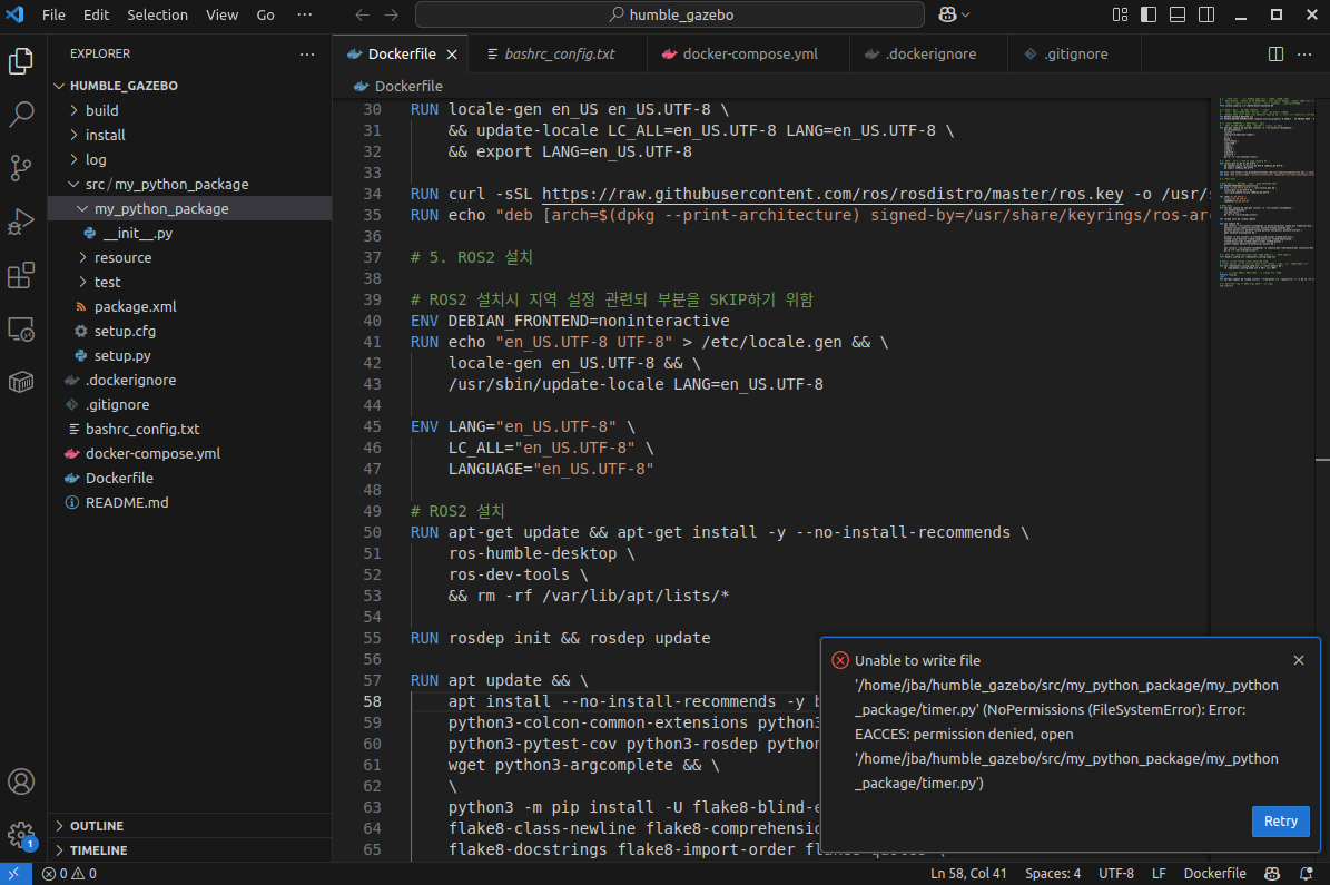 위의 VSCode 화면 좌측 하단을 보면 "Unable to write file ... permission denied ..." 에러가 발생한 것을 볼 수 있다.